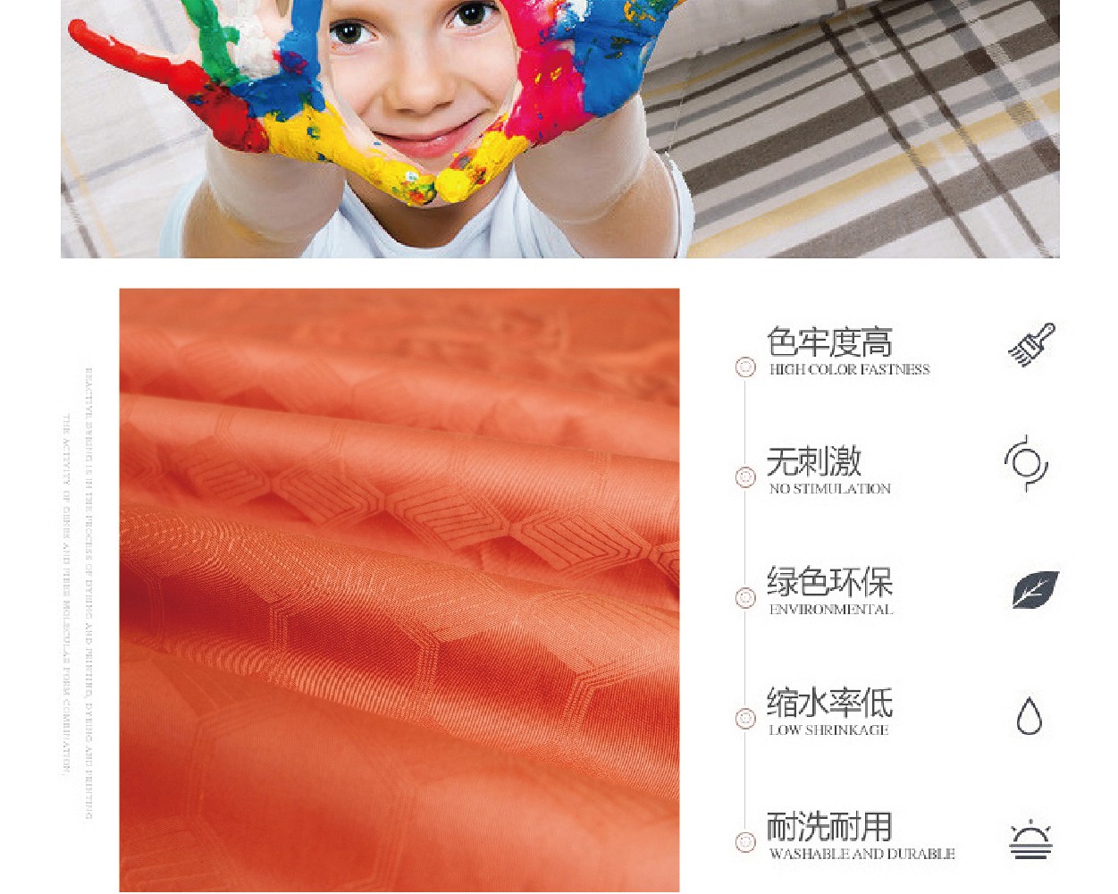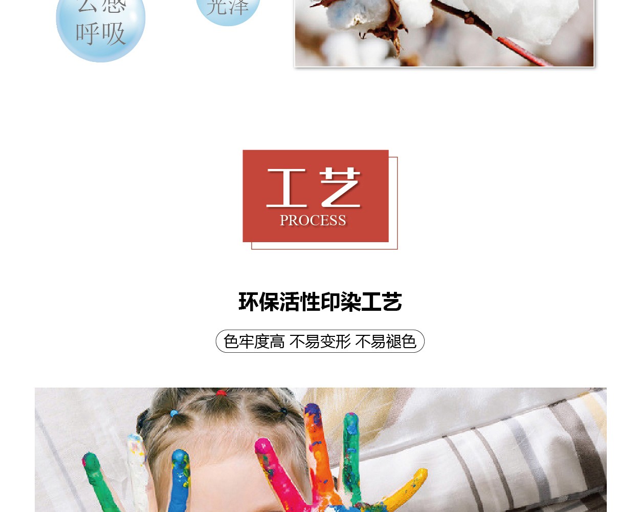 描述:面料使用环保印染处理,有不易退色,不起球等特点,无刺激性气味,小孩也能放心舒睡,100%纯棉面料,精致的提花工艺,让图案更美观,面料更加柔滑,尽显时尚品味。