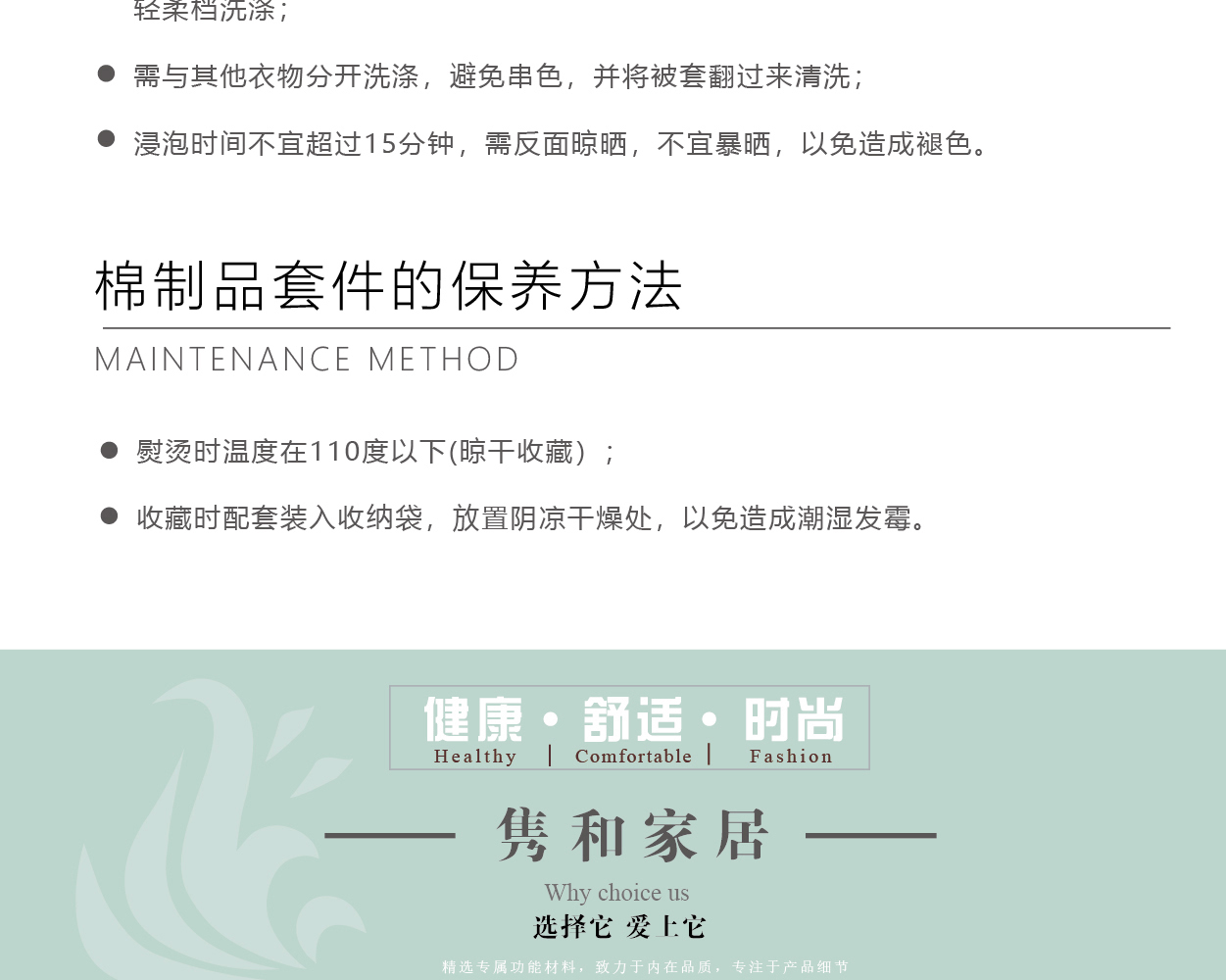 描述:100%纯棉面料,优质环保印染工艺,无任何甲醛、增白剂、安全环保健康 全棉面料,吸湿透气,滑爽亲肤,带给您舒适的睡眠体验