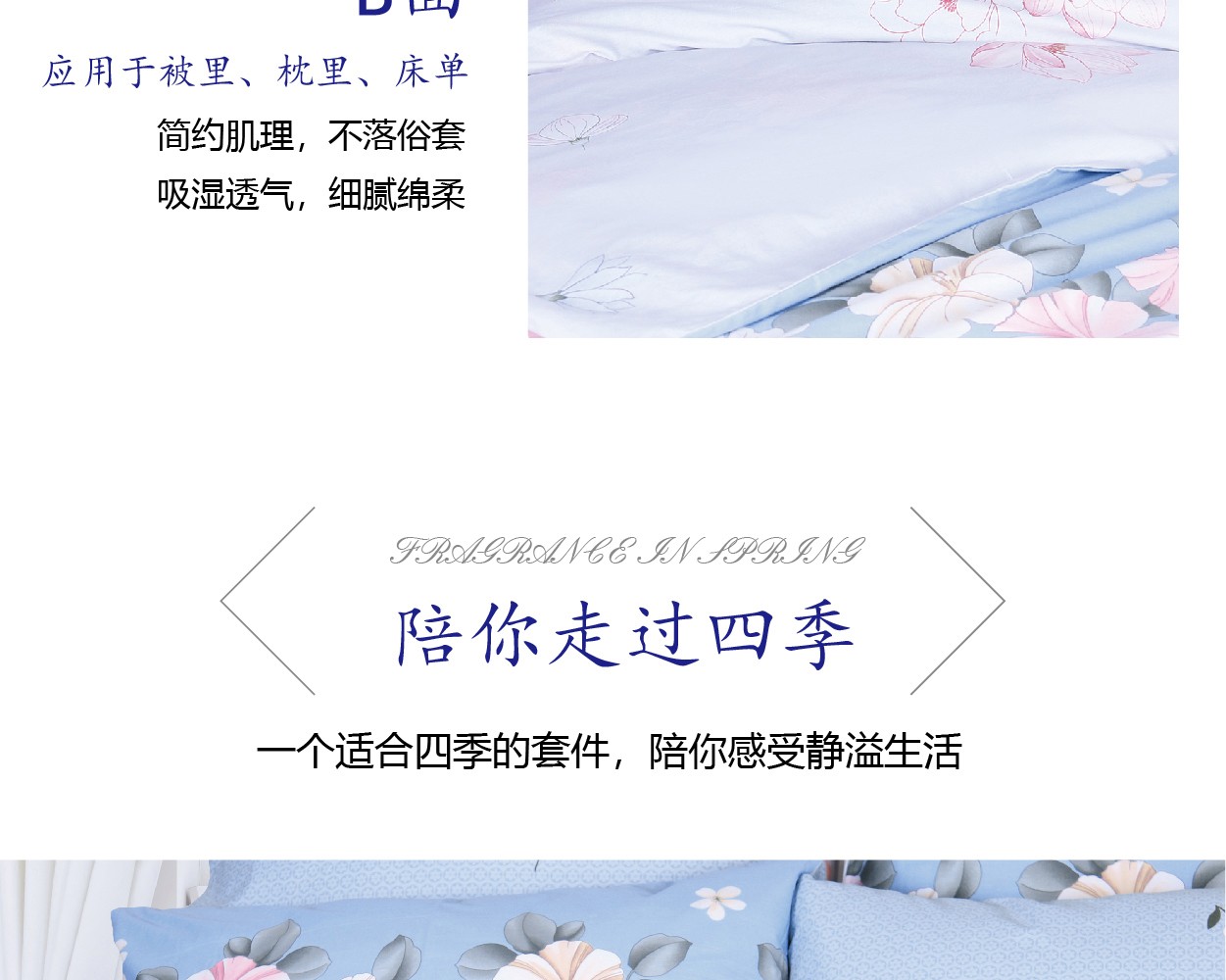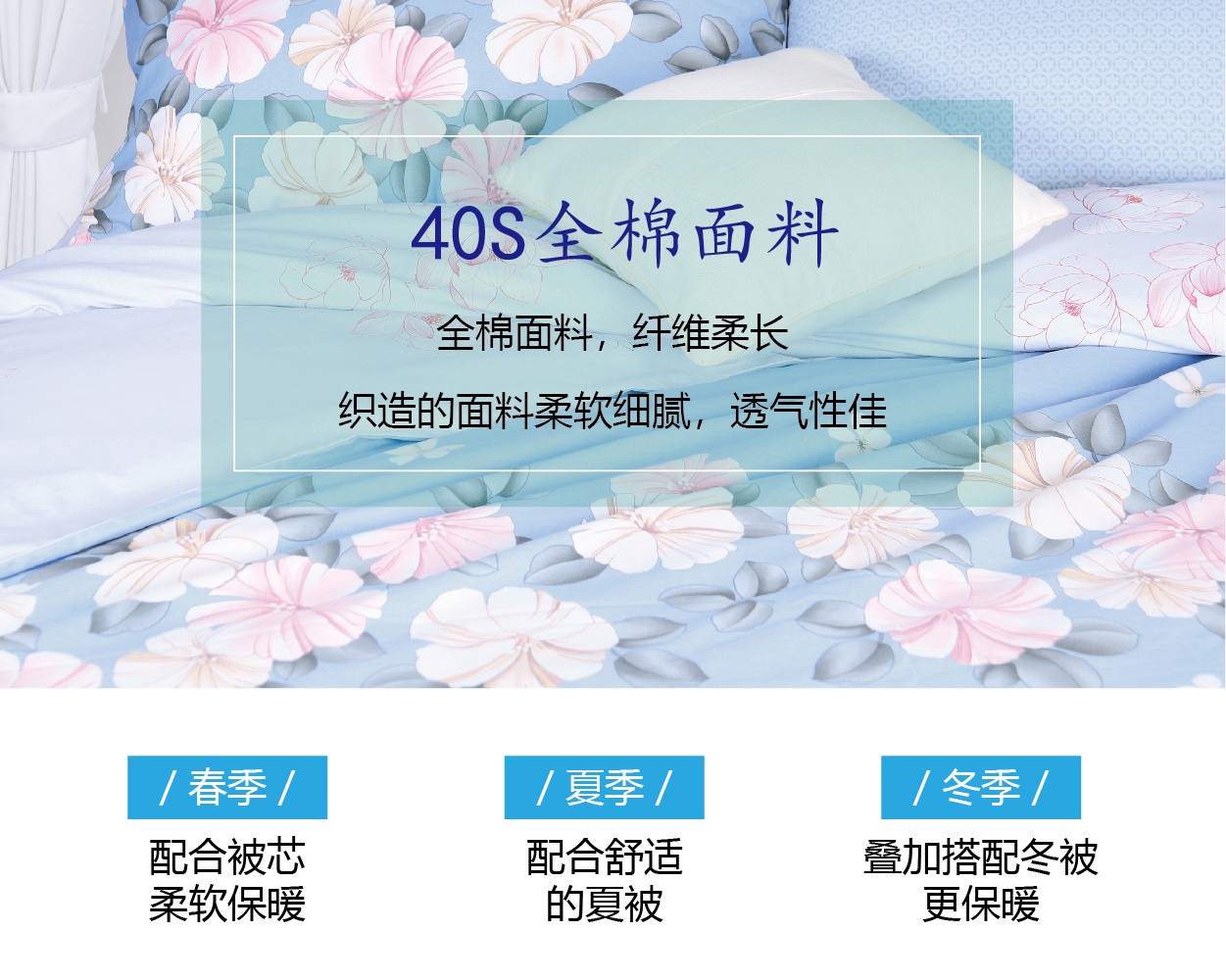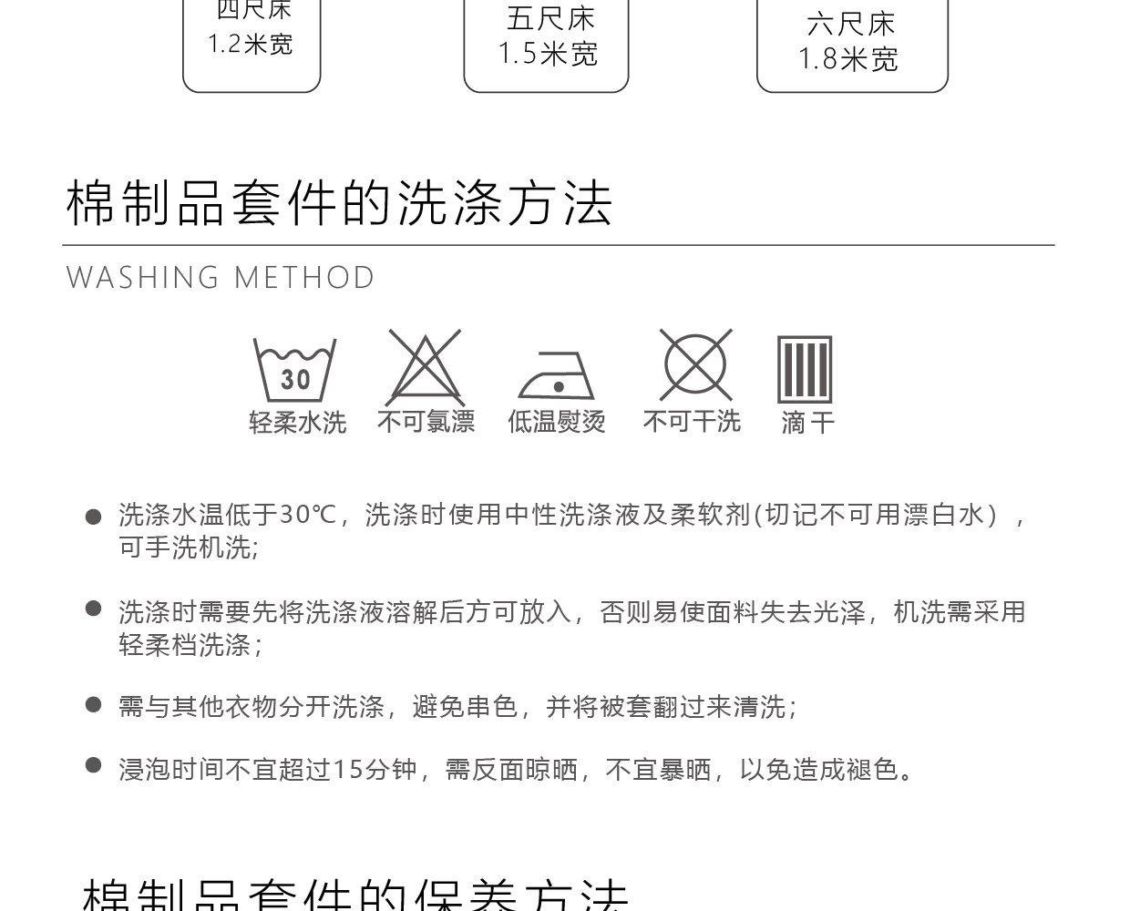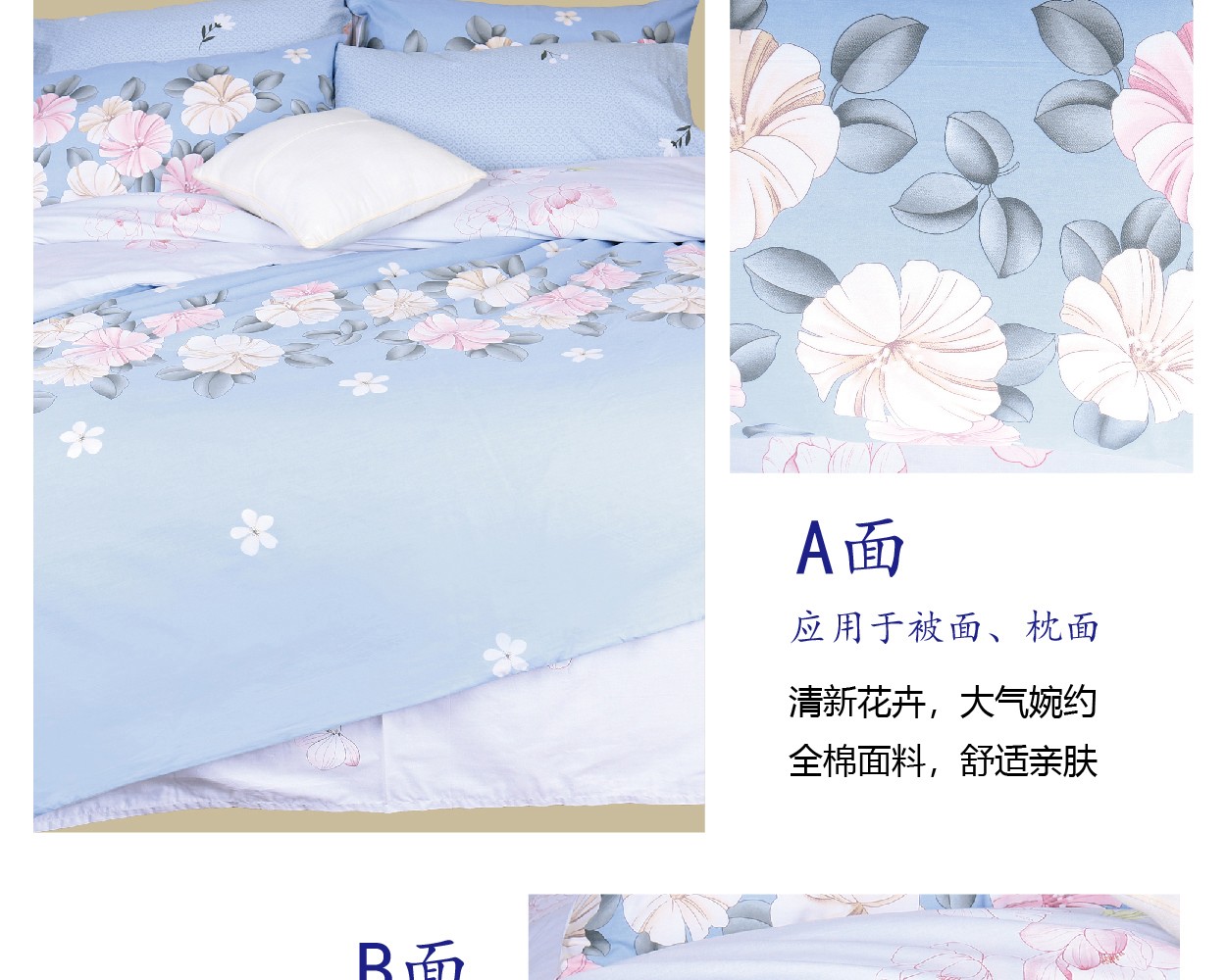 描述:优质环保印染工艺,无任何甲醛、增白剂、安全环保健康 全棉面料,吸湿透气,滑爽亲肤,带给您舒适的睡眠体验 织造面料的每-根纤维选取长度均大于30mm,精梳去除粗纤维,无任何断线起球。