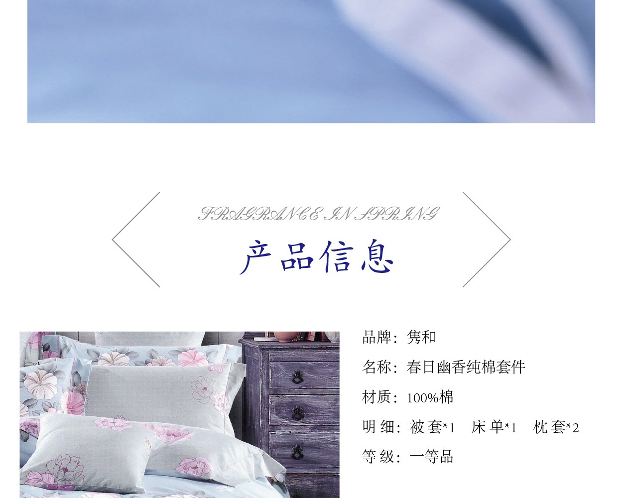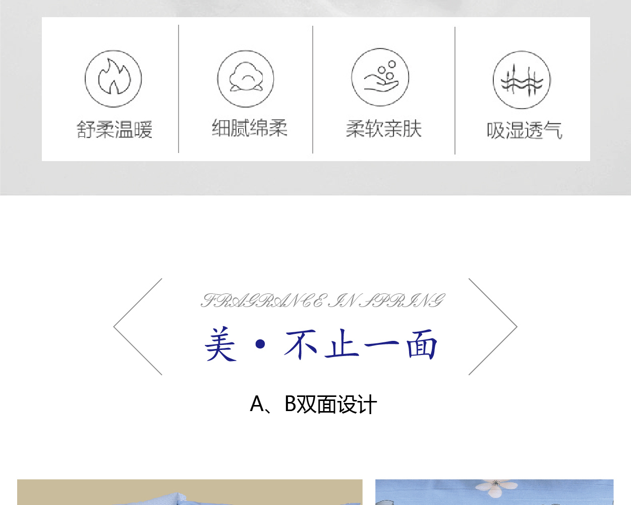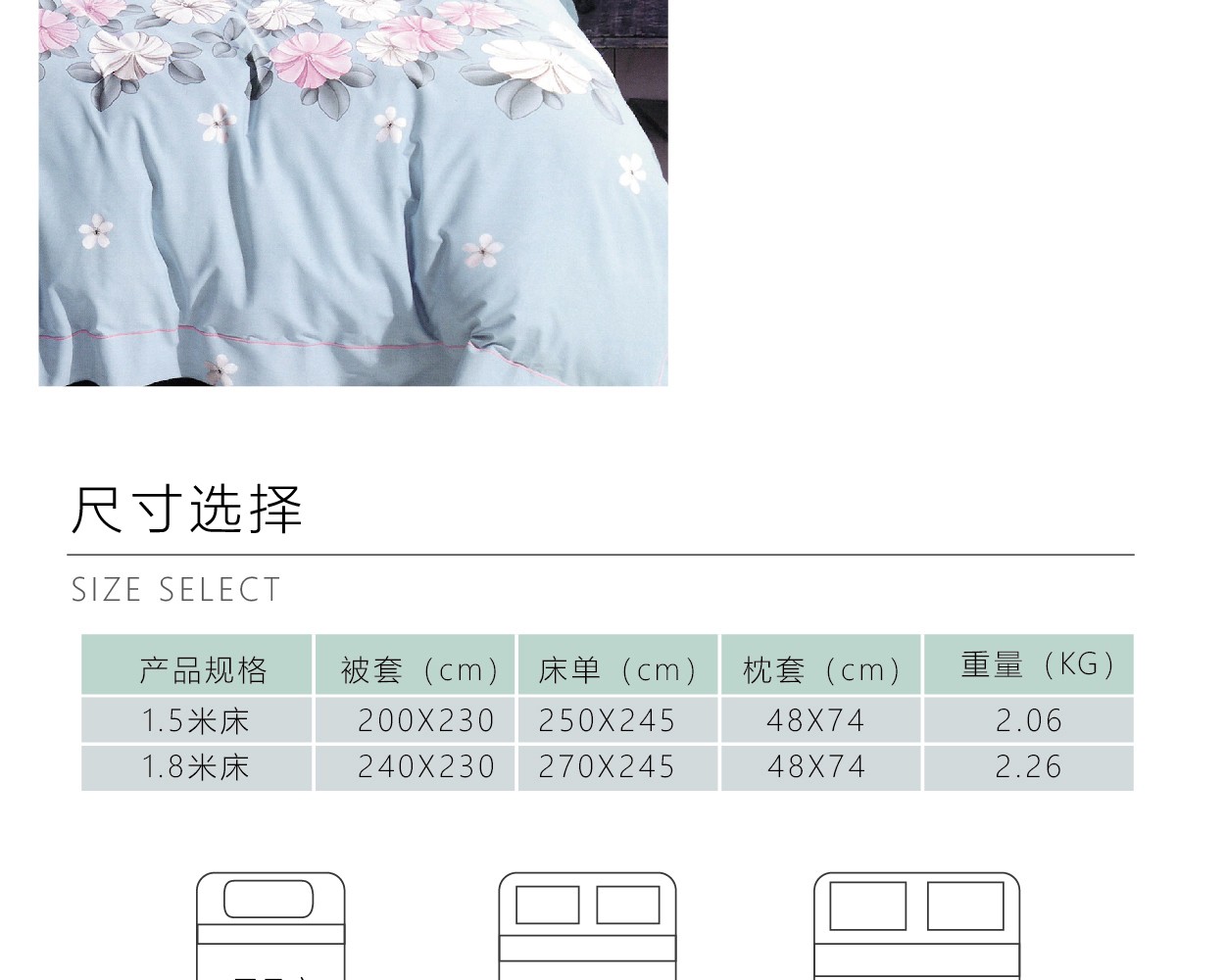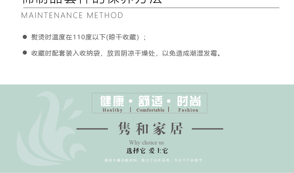 描述:优质环保印染工艺,无任何甲醛、增白剂、安全环保健康 全棉面料,吸湿透气,滑爽亲肤,带给您舒适的睡眠体验 织造面料的每-根纤维选取长度均大于30mm,精梳去除粗纤维,无任何断线起球。