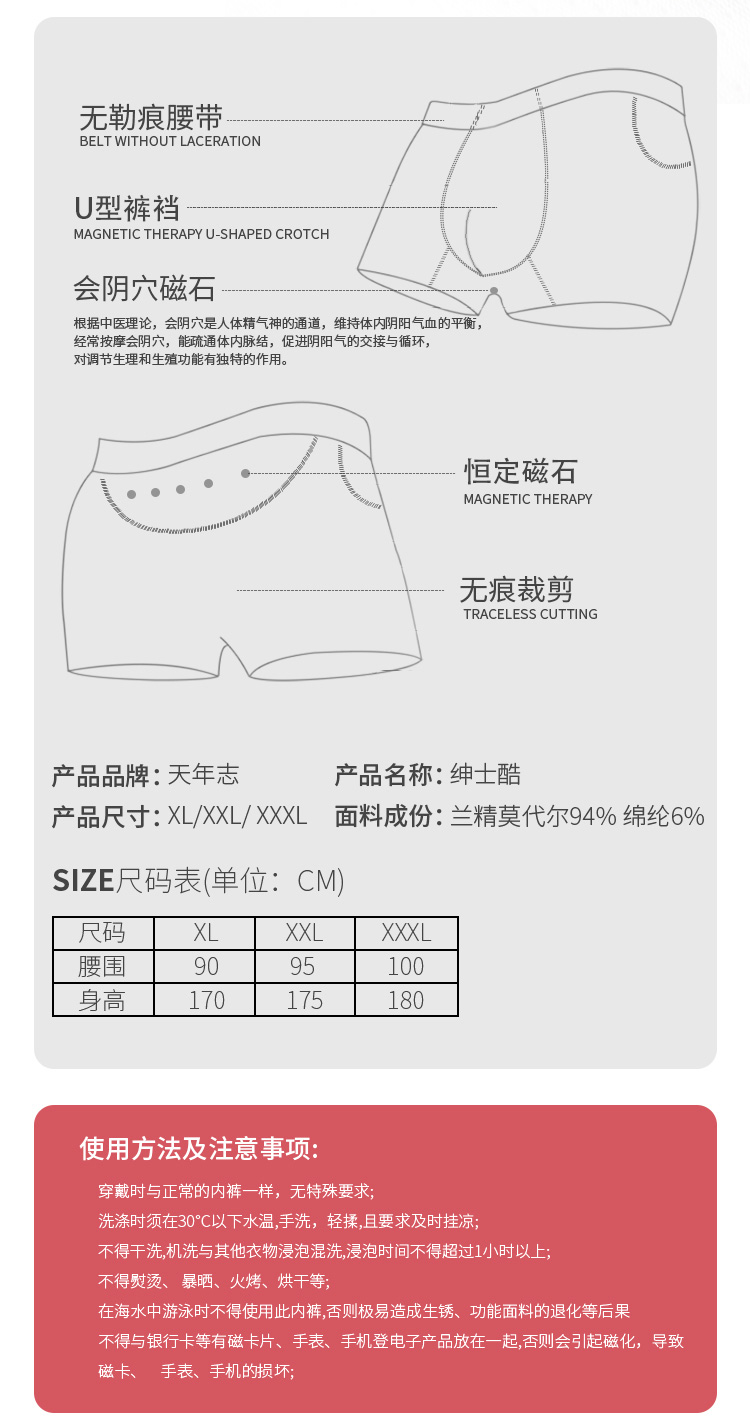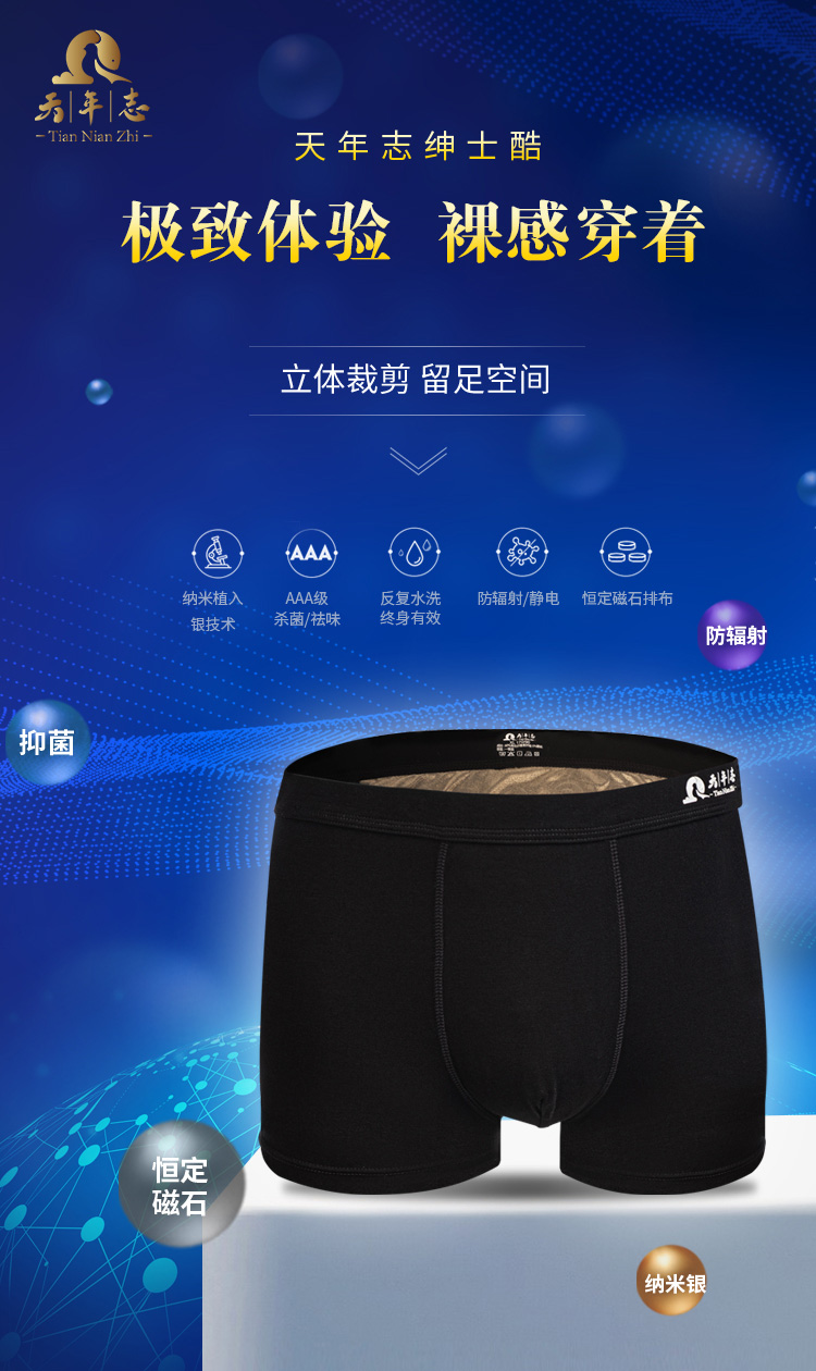 描述:男言之隐事,一裤解烦忧。银甲蔽护前列腺。磁灸时时有。男人雄风抖。磁灸会阴穴,抑菌不留情。男人太空合设计,舒适贴身不委屈。兰精莫代尔面料,让你体验裸装的放松感。