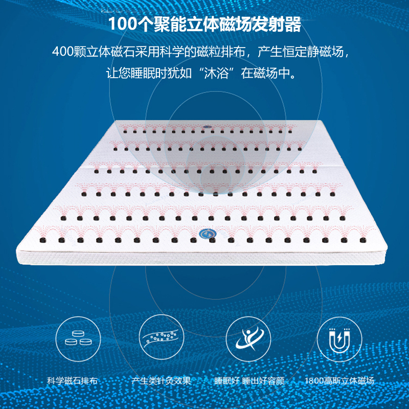 描述:床垫采用托玛琳功能层、恒定能量磁场层、进口环保架桥按摩层、抗菌防螨功能层等13层复合材料结构、400颗磁石、100个磁架形成聚能立体磁场组,产生恒定磁场、符合弹性按摩垫、突球型设计人躺在上面能持续享受类指压按摩效果,竹炭纤维吸附身体产生的异味辅助负氧离子让卧室跟清新,让你尽情享受好睡眠。